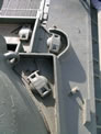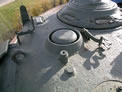 The overhead shot of the driver's hatch shows the final configuration of the small hatch. The counterbalance spring, hold-open latch, and periscope guard were all introduced after production started. The two double hooks are for the driver's foul weather hood and are not present on the co-driver's side.