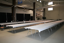 and vendors were setting up. The empty display tables took up half