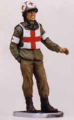 a Red Cross bib on his chest. He wears the M1943 OD combat jacket