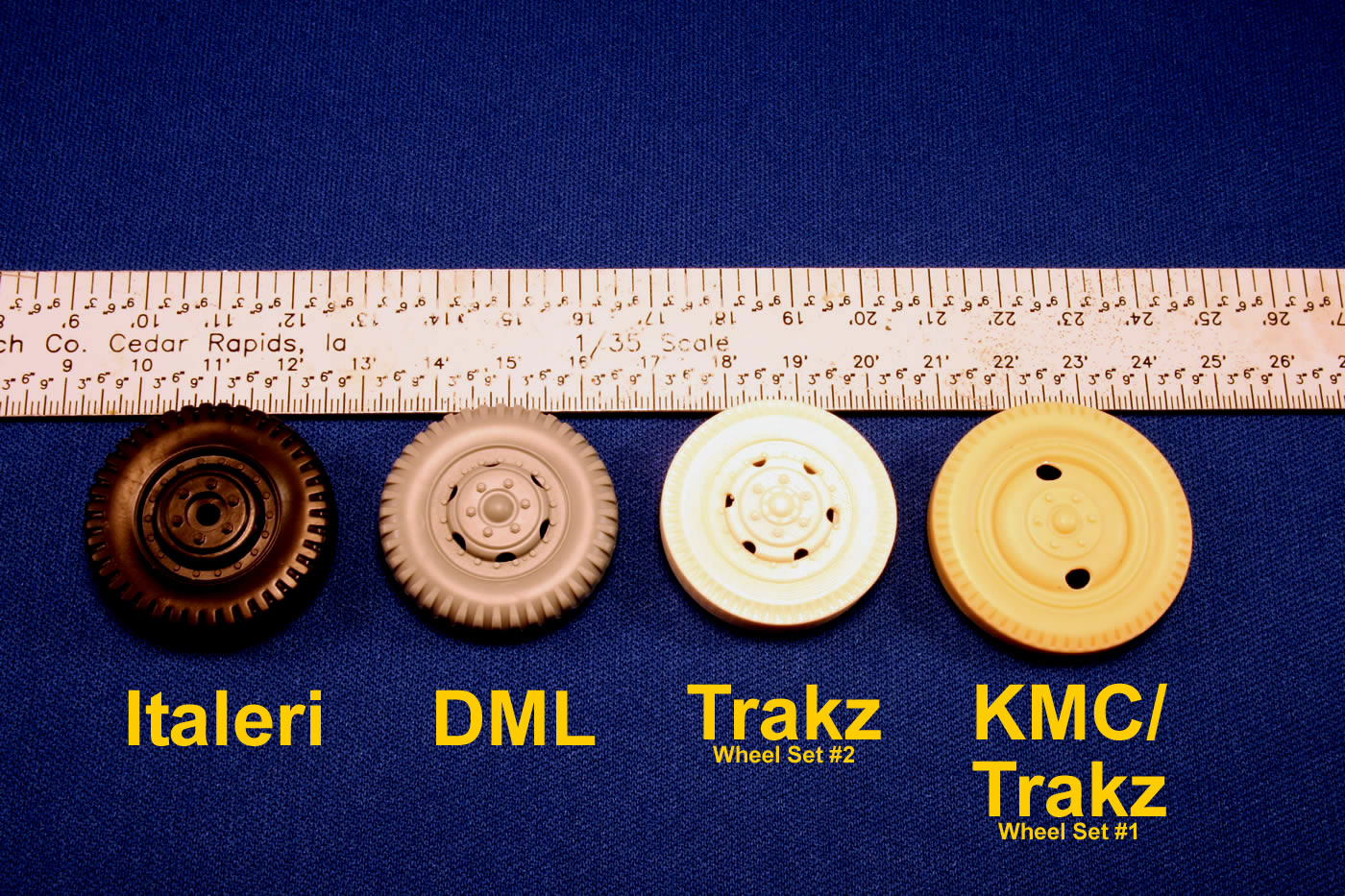 Italeri, DML, and Trakz 2 tires are mounted on divided combat wheels, the Trakz