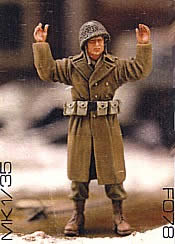 This GI stands with his arms raised. He wears a long melton overcoat,