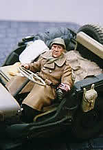 is a jeep driver in a wool melton greatcoat, one hand on the steering